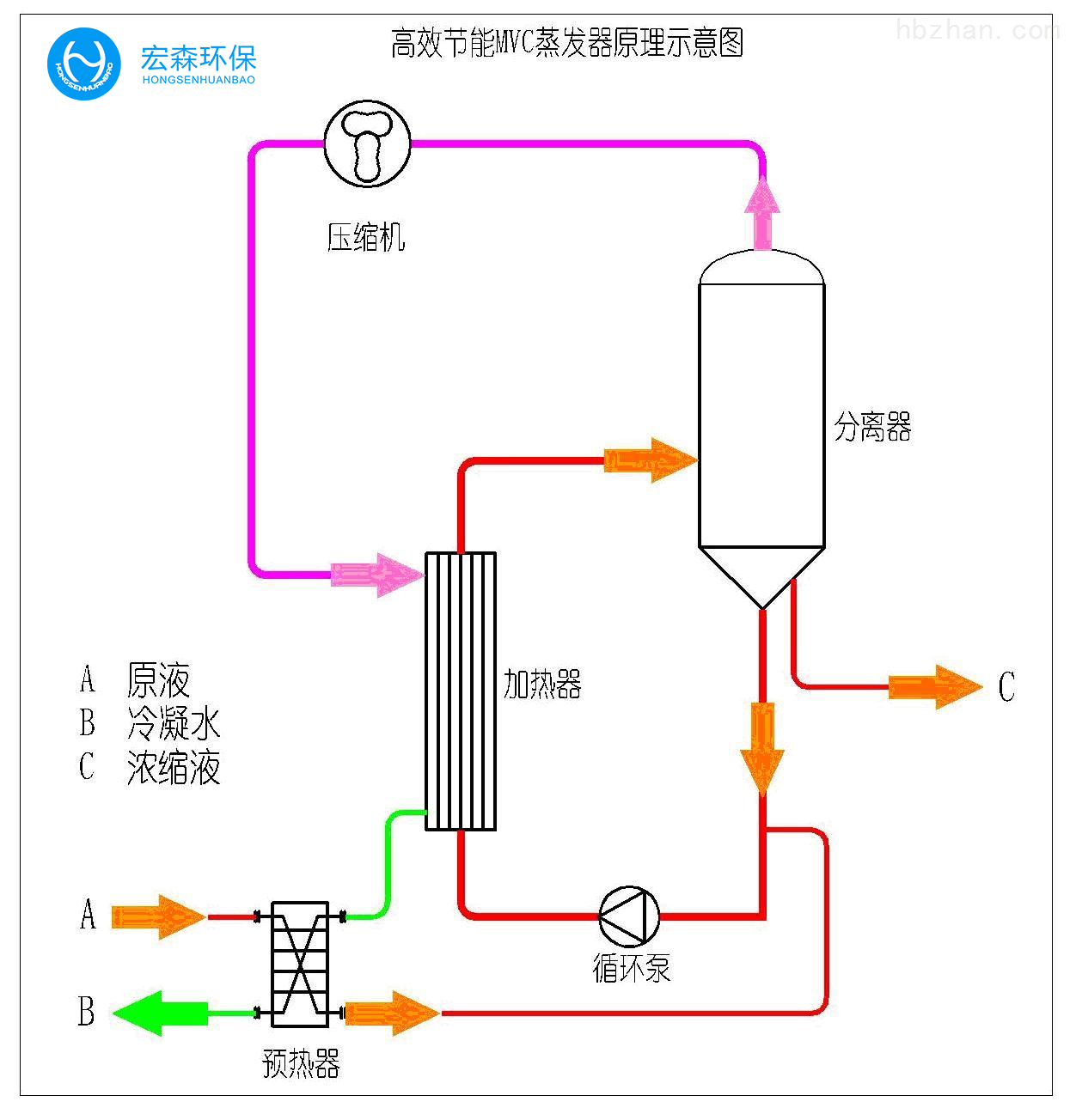 氯化鈉存在于各種類型的廢水中,想要零排放得使用專用蒸發結晶裝置將其蒸發結晶析出。該裝置采用了一級降膜預濃縮,二級強制循環蒸發結晶的“MVR-多級蒸發”工藝流程。一二級蒸發器并用一臺壓縮機,物料經一級降膜蒸發器濃縮至近飽和,在第二級濃縮至氯化鈉晶體析出,較后通過離心機固液分離,得到氯化鈉產品。